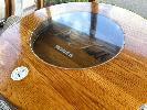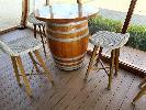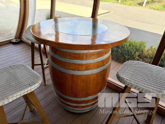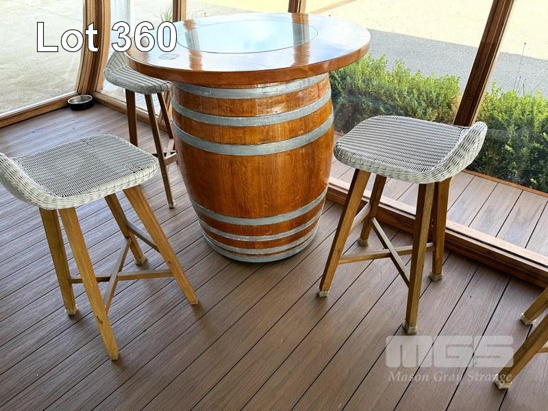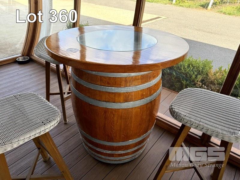 TIMBER WINE BARREL, POLISHED WITH CIRCULAR TIMBER & GLASS TOP WITH 3 z WHITE RATTAN TIMBER FRAMED BAR STOOLS