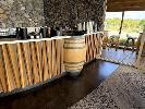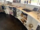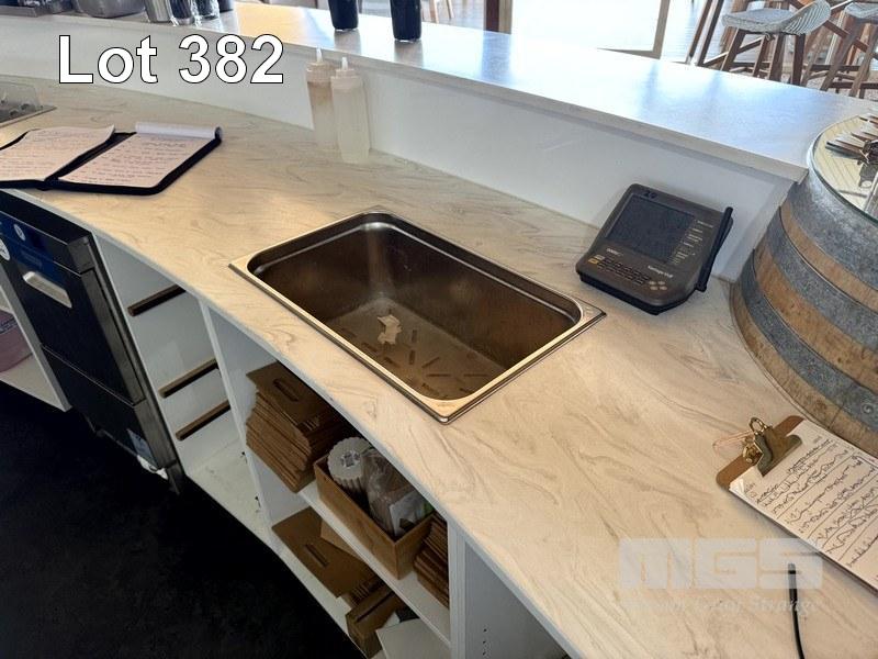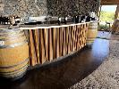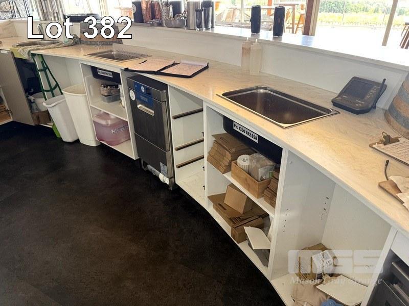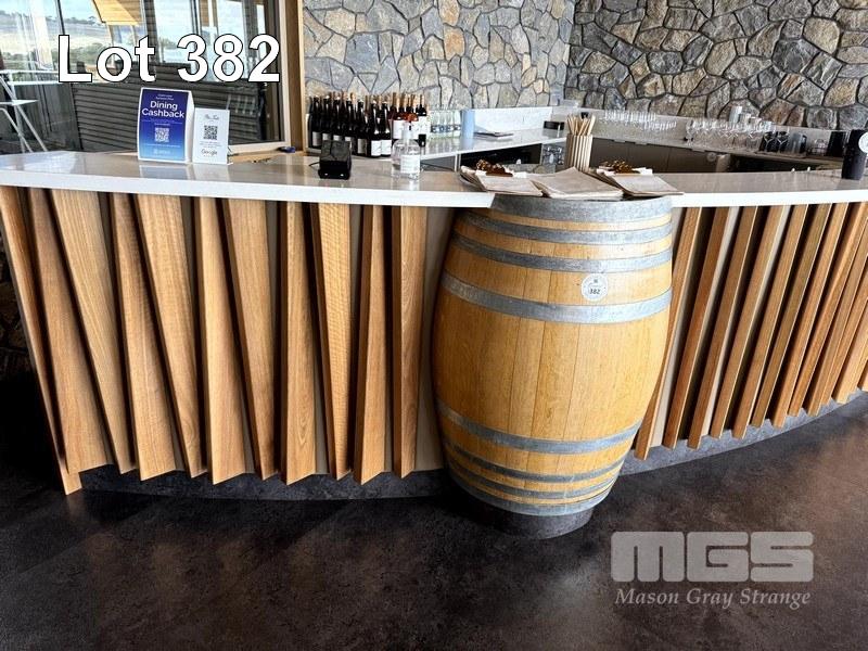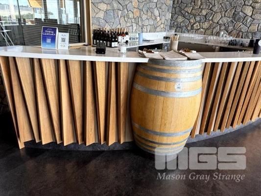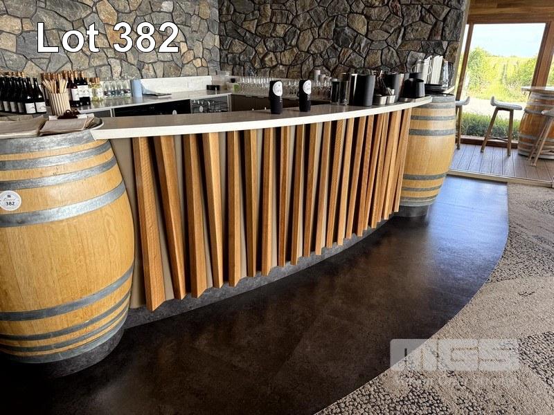 LARGE CURVED FRONTED BAR SERVERY COUNTER OF APPROXIMATELY 8 METRE LENGTH WITH MARBLE LOOK BENCHTOPS, TIMBER & LEATHER INLAY TO FRONT, INCORPORATING 2 x WINE BARRELS, FITTED WITH 3 x STAINLESS STEEL SINKS, CABINETS AND UNDERBAR STORAGE