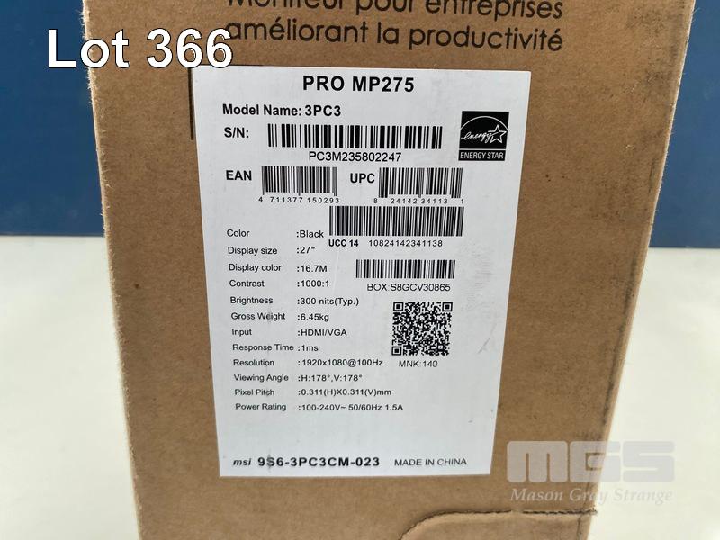 MONITOR, MSI PRO 27 INCH MP275 FHD 100HZ - BLACK, MON-MSI-MP275 (RRP $199) (BOXED) (SUBJECT TO INSURANCE CLAIM) S/N:PC3M235802247