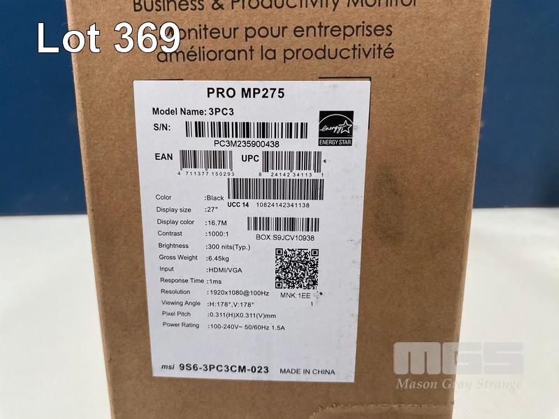 MONITOR, MSI PRO 27 INCH MP275 FHD 100HZ - BLACK, MON-MSI-MP275 (RRP $199) (BOXED) (SUBJECT TO INSURANCE CLAIM) S/N:PC3M235900438