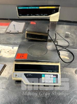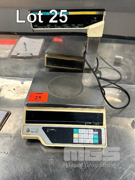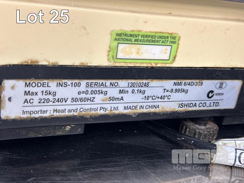 ISHIDA DIGITAL SCALE, POOR CONDITION, STAINLESS STEEL BENCH, 2200 x 600mm & 2 DOOR CABINET WITH KITCHEN SUNDRIES