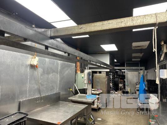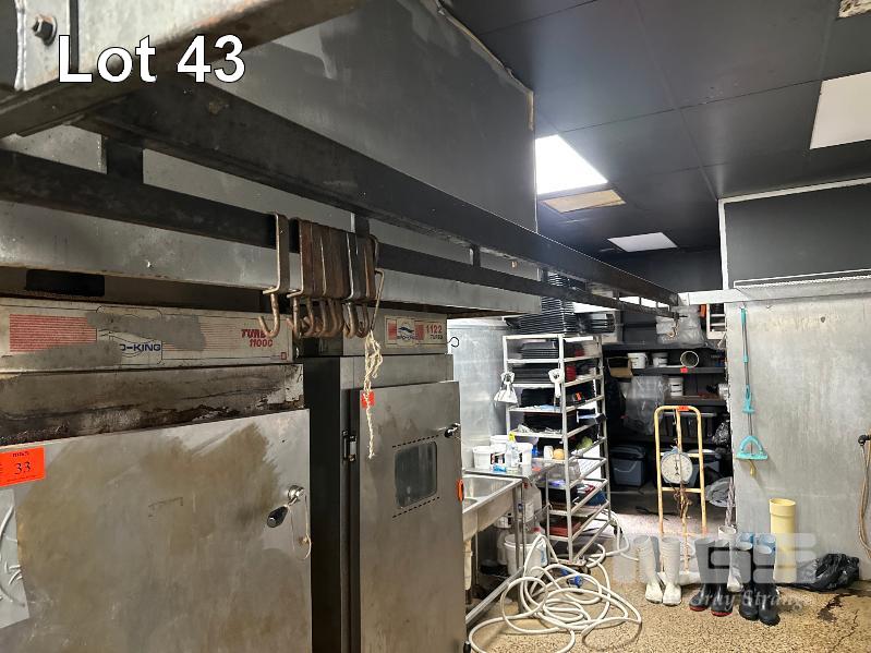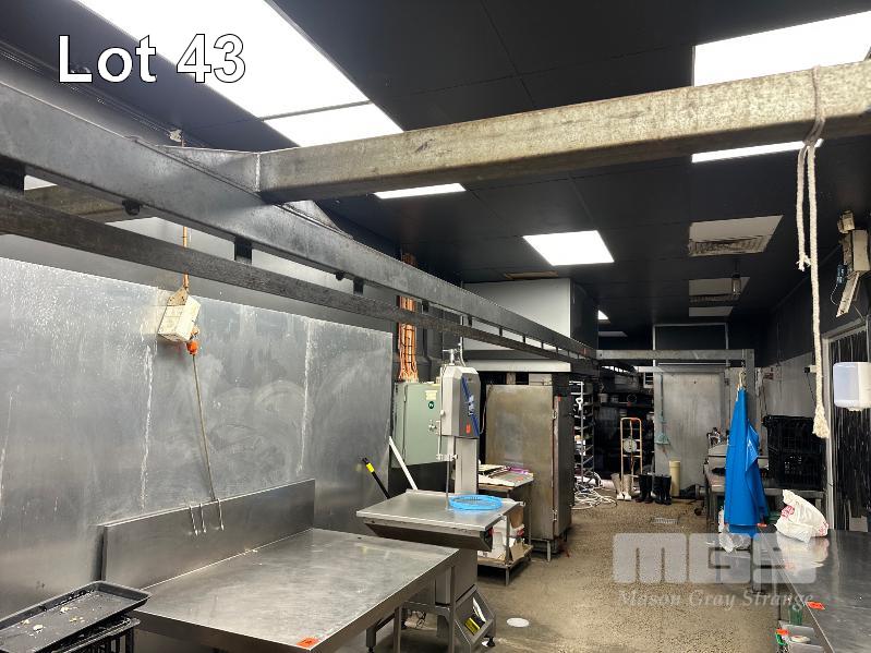 LINEAR MEAT RAILS 13m (L), FREESTANDING BOLTED FRAME, 2 x CRATES HOOKS BUYER TO DISMANTLE