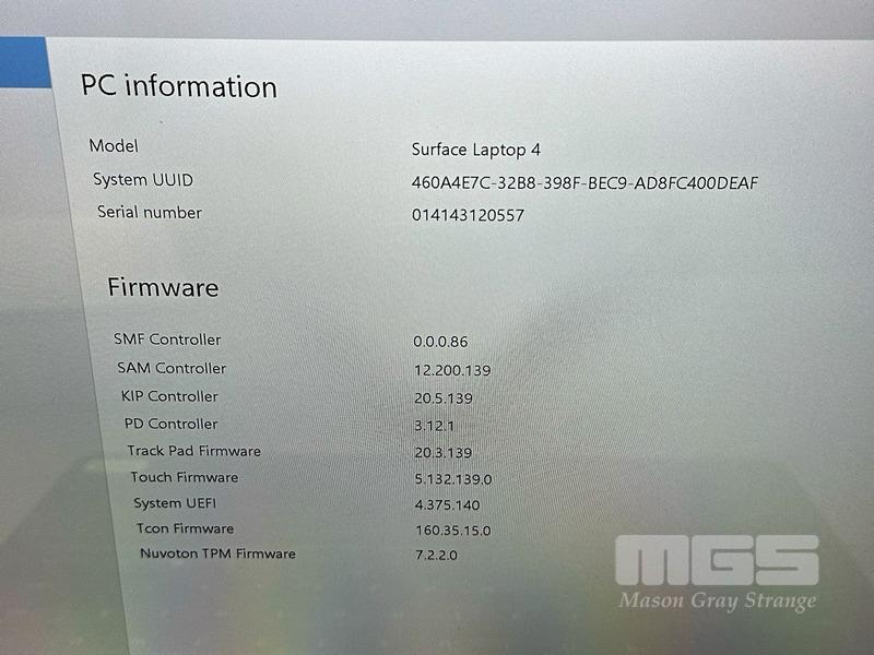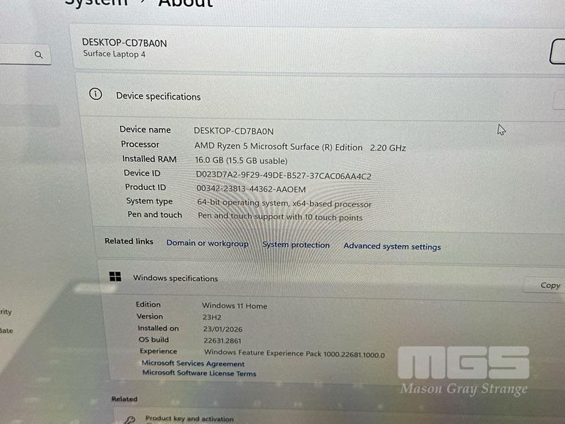 LAPTOP, MICROSOFT SURFACE 4, MODEL 1959, AMD RYZEN 5 @ 2.2GHz, 16GB RAM, 256GB NVMe M.2 SSD, 13.5" TOUCHSCREEN (2256x1504), Wi-Fi, BLUETOOTH, WINDOWS 11 HOME INSTALLED & POWER SUPPLY