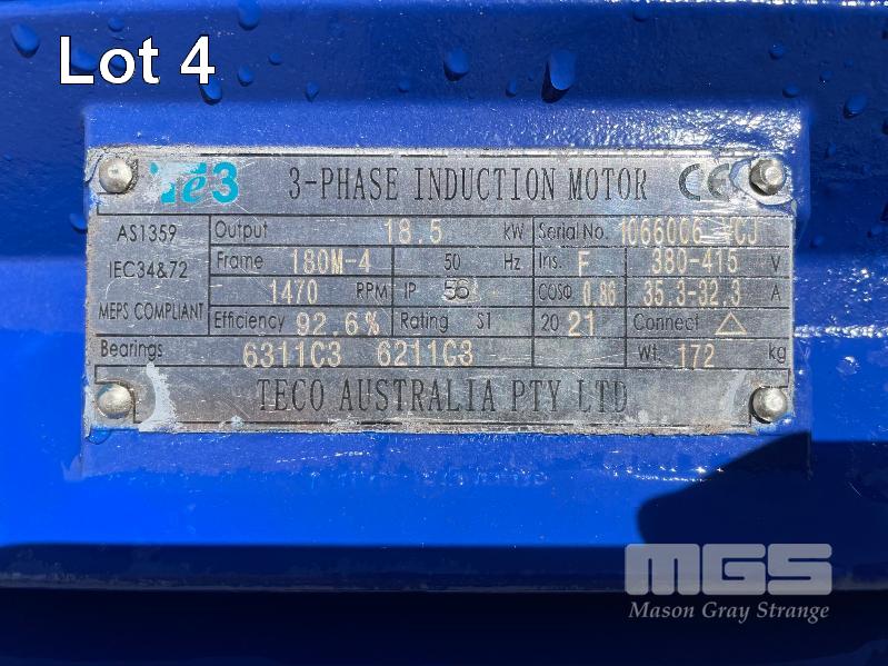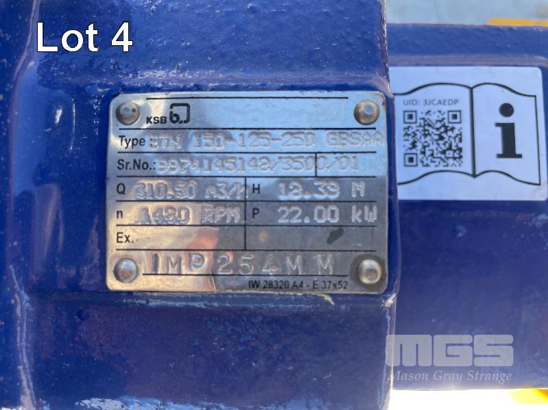 KSB HIGH VOLUME INDUSTRIAL WATER PUMP WITH 3 PHASE INDUCTION MOTOR, INDUCTION MOTOR: 18.5kW, SERIAL: 1066006VCJ, FRAME: 180M-4, RPM: 1470, DOM: 2021, 415V KSB PUMP: TYPE: ETN 150-125-250 GBSAA, Q: 310.50 m3/h, n: 1420 rpm, H: 12.39, P: 22.00kw ON SKID BASE