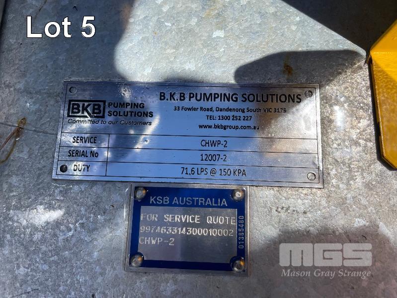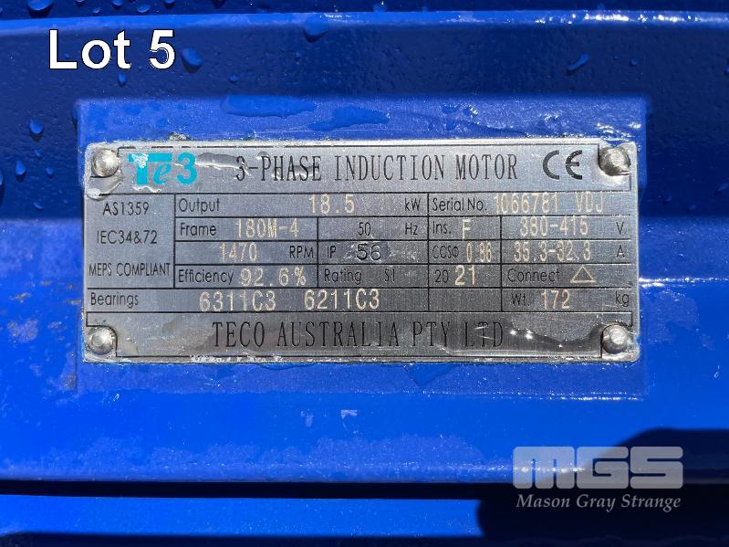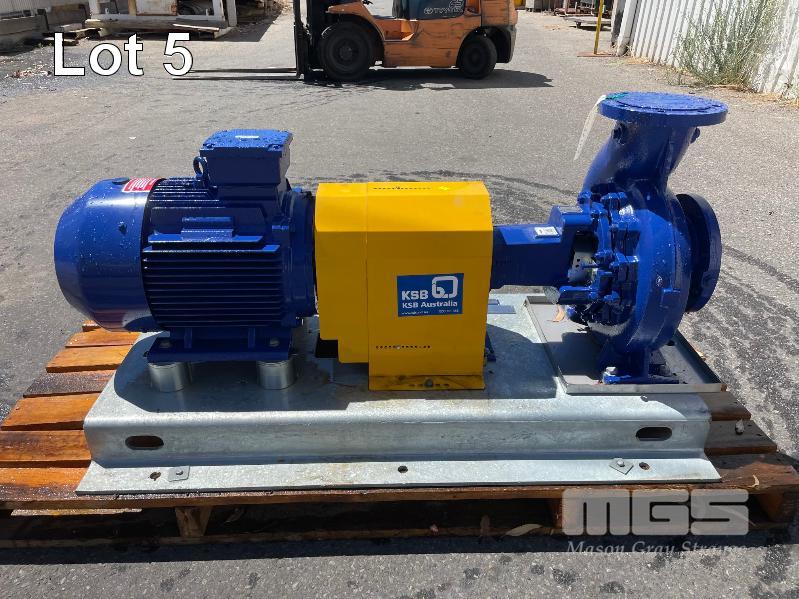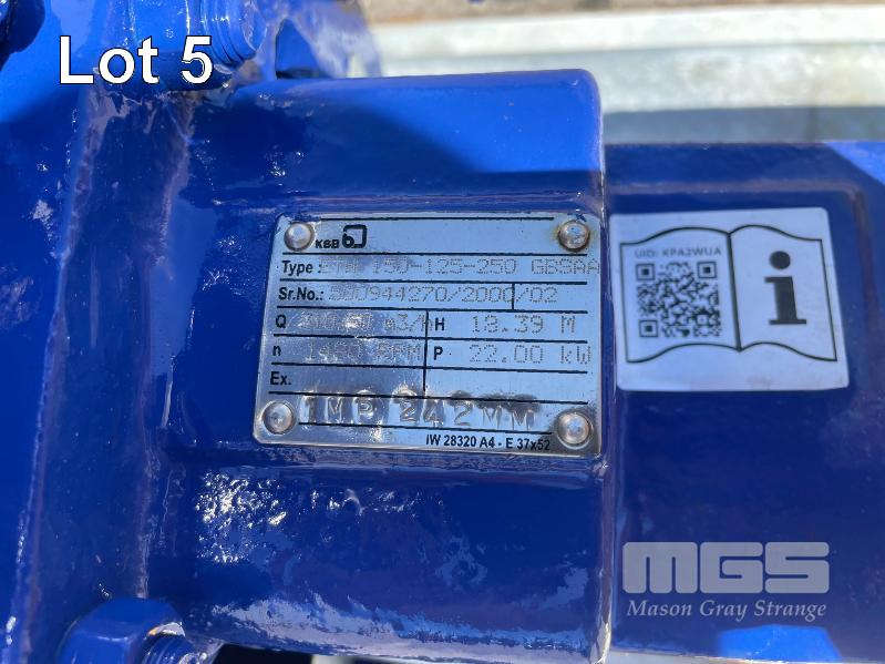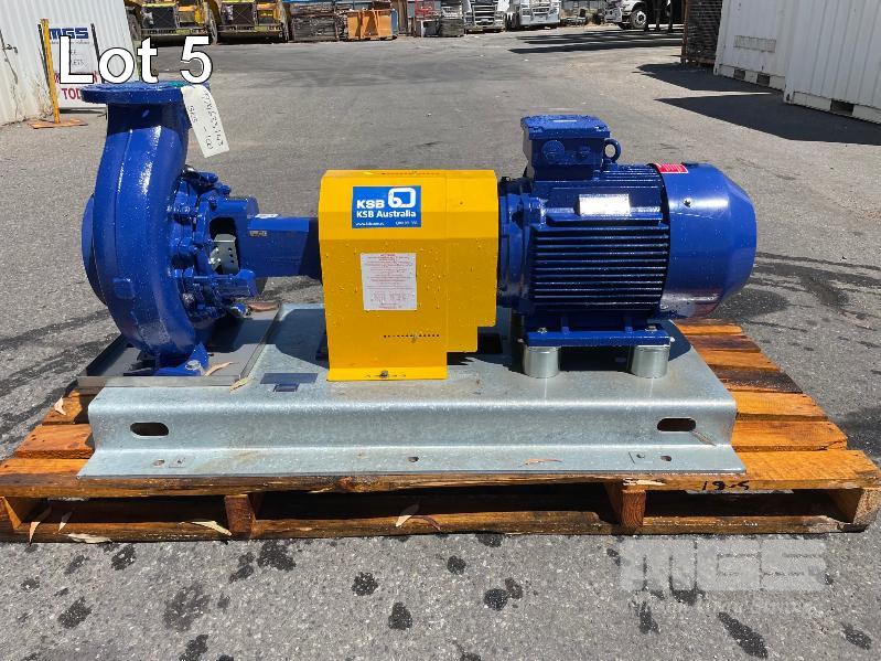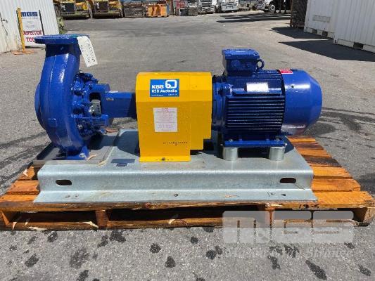 KSB HIGH VOLUME INDUSTRIAL WATER PUMP WITH 3 PHASE INDUCTION MOTOR, INDUCTION MOTOR: 18.5kW, SERIAL: 1066781 VDJ, FRAME: 180M-4, RPM: 1470, DOM: 2021, 415V KSB PUMP: TYPE: ETN 150-125-250 GBSAA, Q: 310.50m3/h, n: 1480 rpm, H: 18.39, P: 22.00kw ON SKID BASE