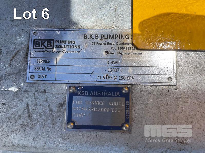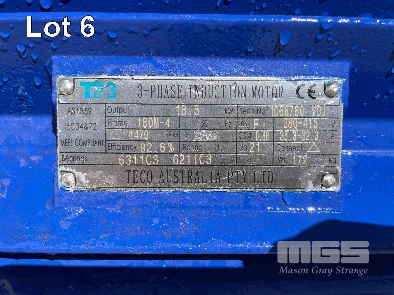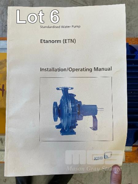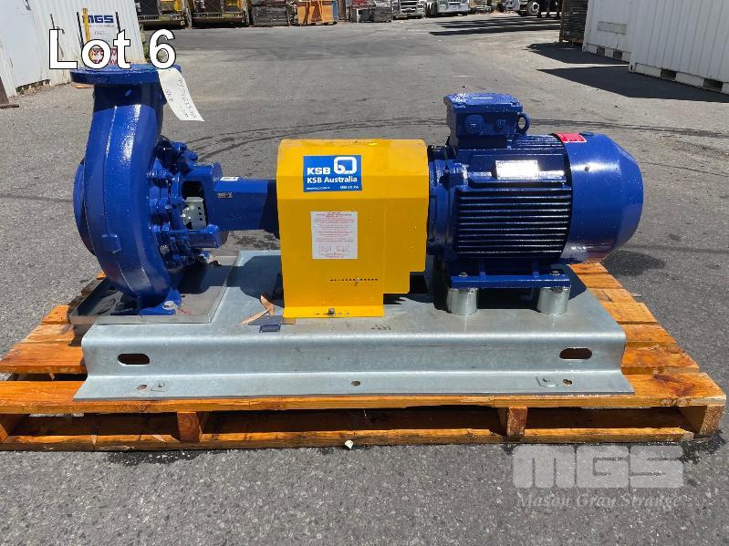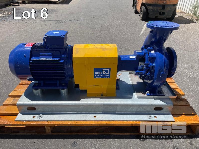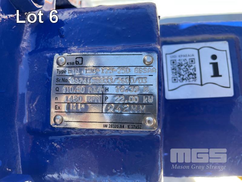 KSB HIGH VOLUME INDUSTRIAL WATER PUMP WITH 3 PHASE INDUCTION MOTOR, INDUCTION MOTOR: 18.5kW, SERIAL: 1066780 VDJ, FRAME: 180M-4, RPM: 1470, DOM: 2021, 415V KSB PUMP: TYPE: ETN 150-125-250 GBSAA, Q: 310.50m3/h, n: 1480 rpm, H: 18.39, P: 22.00kw ON SKID BASE, WITH INSTALLATION/ OPERATING MANUAL