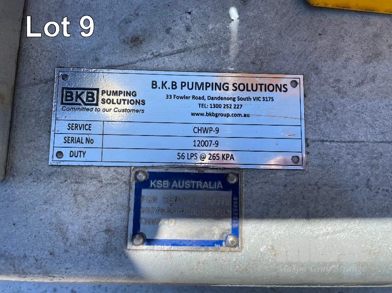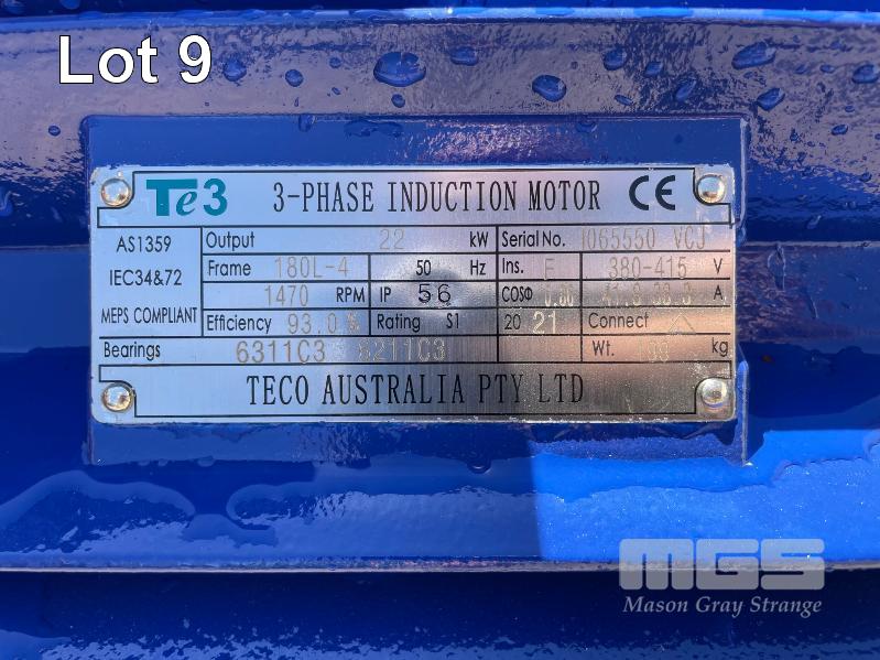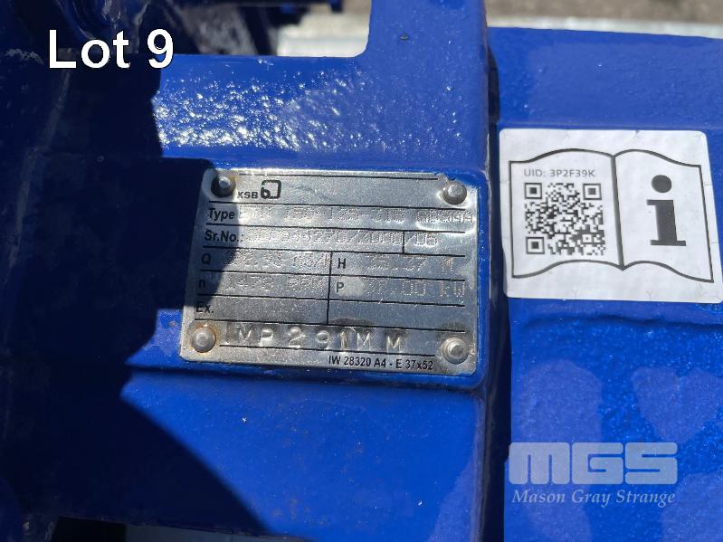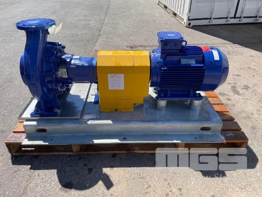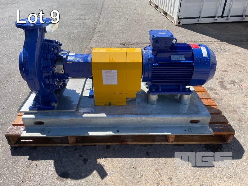 KSB HIGH VOLUME INDUSTRIAL WATER PUMP WITH 3 PHASE INDUCTION MOTOR, INDUCTION MOTOR: 22kW, SERIAL: 1065550 VCJ, FRAME: 180L-4, RPM: 1470, DOM: 2021, 415V KSB PUMP: TYPE: ETN 150-125-315 GBSAA, Q: 288.93m3/h, n: 1478 rpm, H: 35.37, P: 37.00kw ON SKID BASE