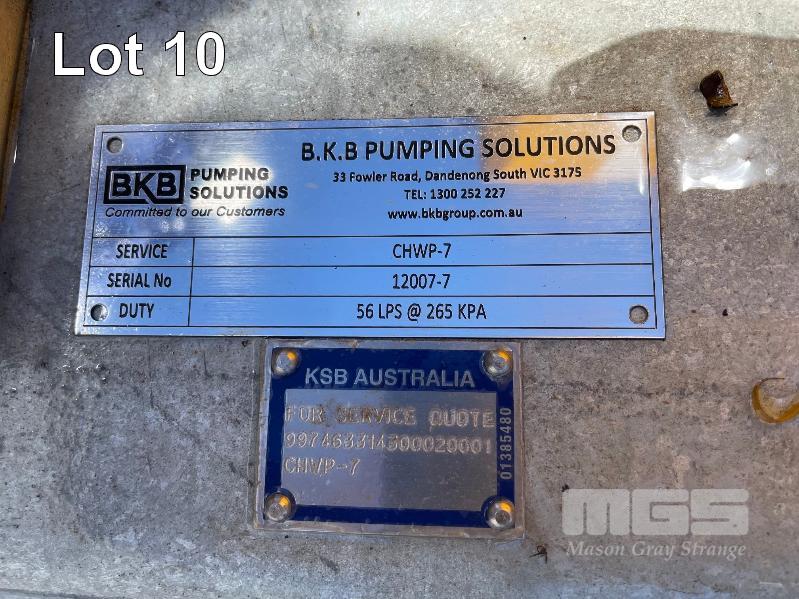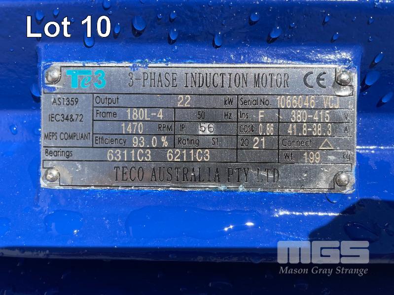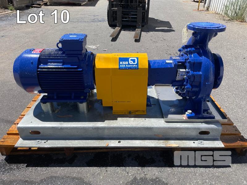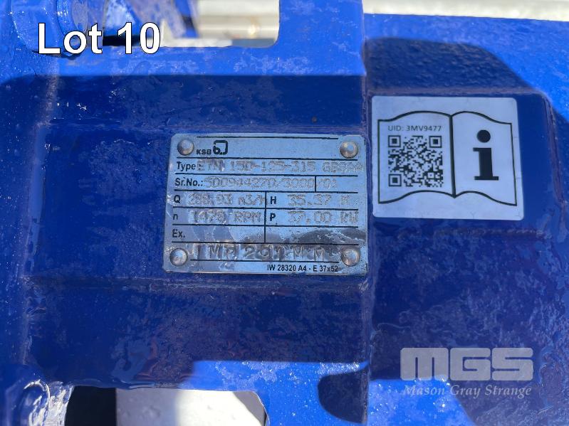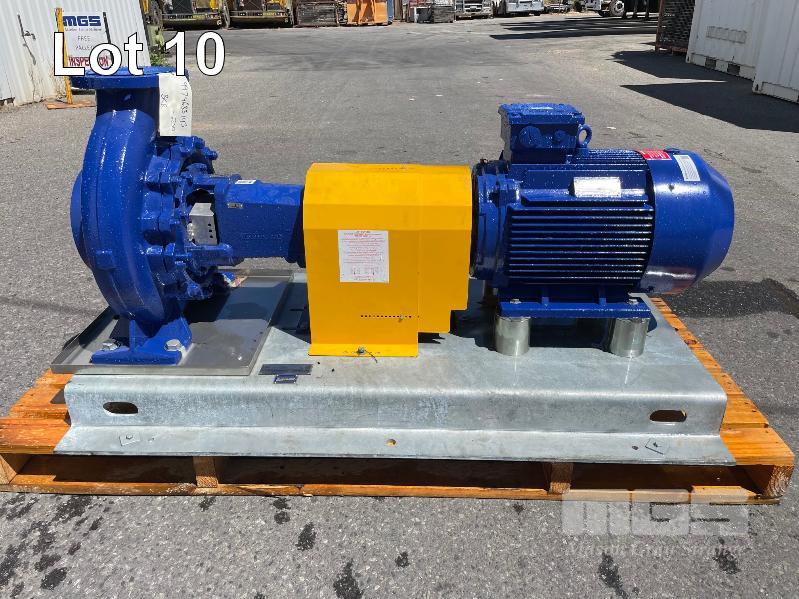 KSB HIGH VOLUME INDUSTRIAL WATER PUMP WITH 3 PHASE INDUCTION MOTOR, INDUCTION MOTOR: 22kW, SERIAL: 1066046 VCJ, FRAME: 180L-4, RPM: 1470, DOM: 2021, 415V KSB PUMP: TYPE: ETN 150-125-315 GBSAA, Q: 288.93m3/h, n: 1470 rpm, H: 35.37, P: 37.00kw ON SKID BASE