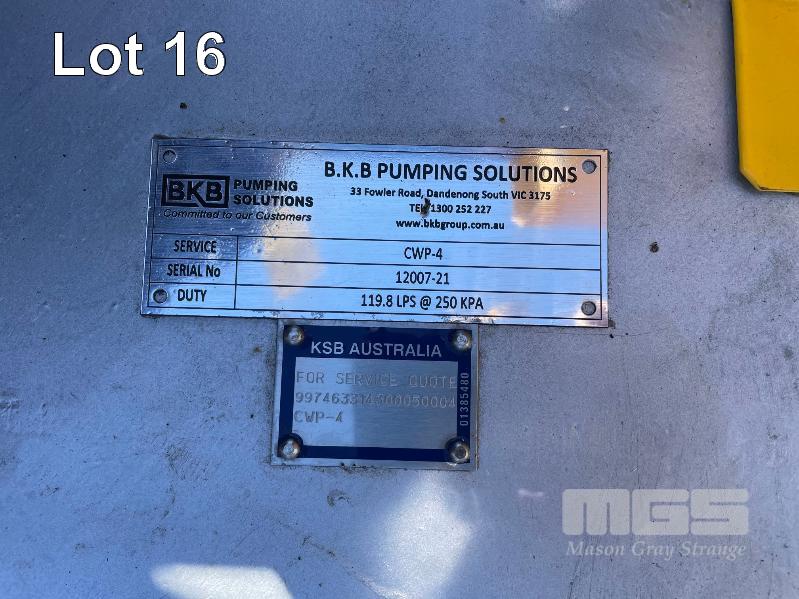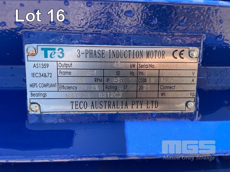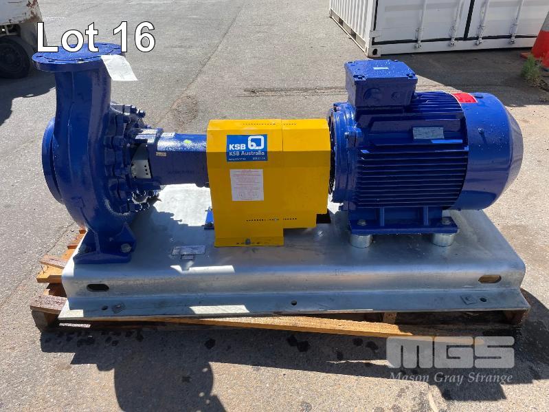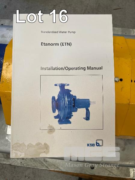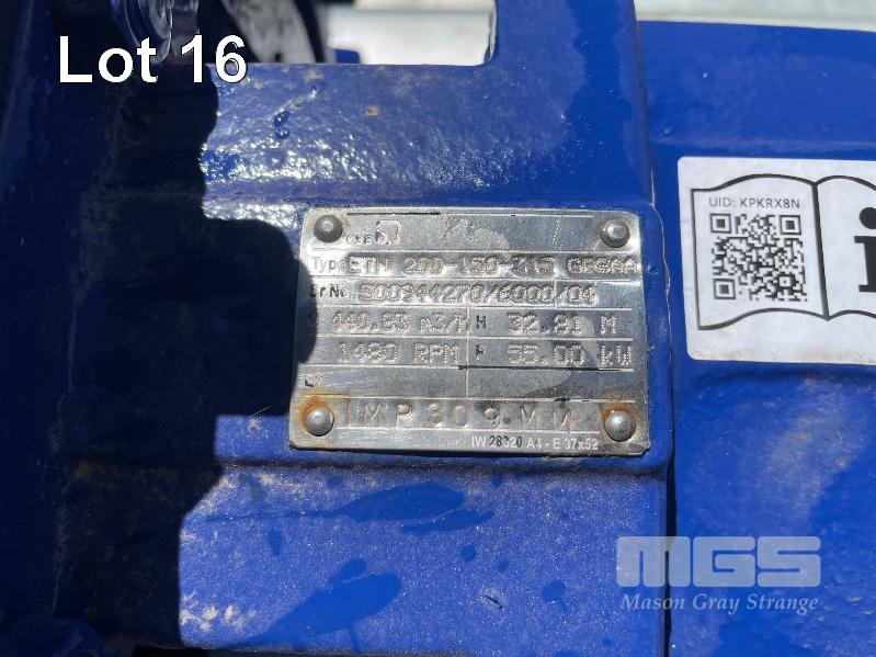 KSB HIGH VOLUME INDUSTRIAL WATER PUMP WITH 3 PHASE INDUCTION MOTOR, INDUCTION MOTOR: 55kW, SERIAL: 1066734 VDJ, FRAME: 225M-4, RPM: 1480, DOM: 2021, 415V KSB PUMP: TYPE: ETN 200-150-315 GBSAA, Q: 440.83m3/h, n: 1480 rpm, H: 32.81, P: 55.00kw ON SKID BASE WITH INSTALLATION/ OPERATING MANUAL
