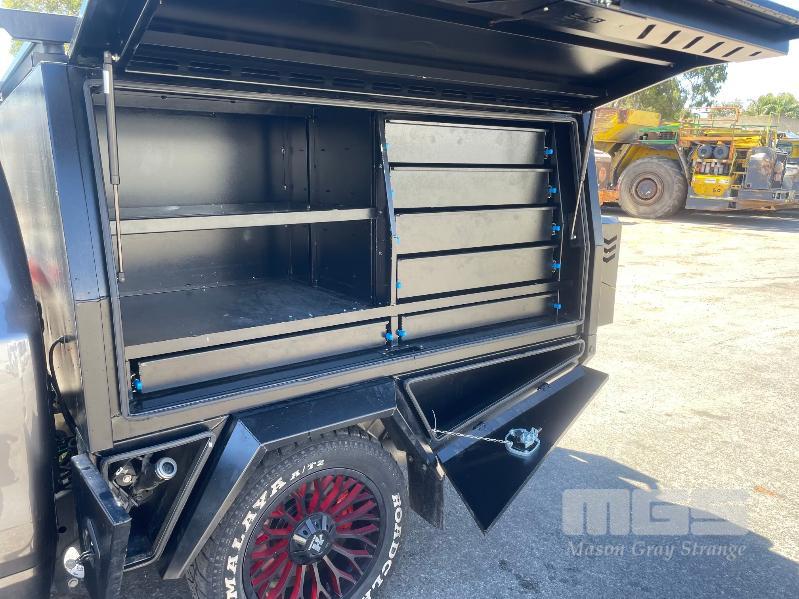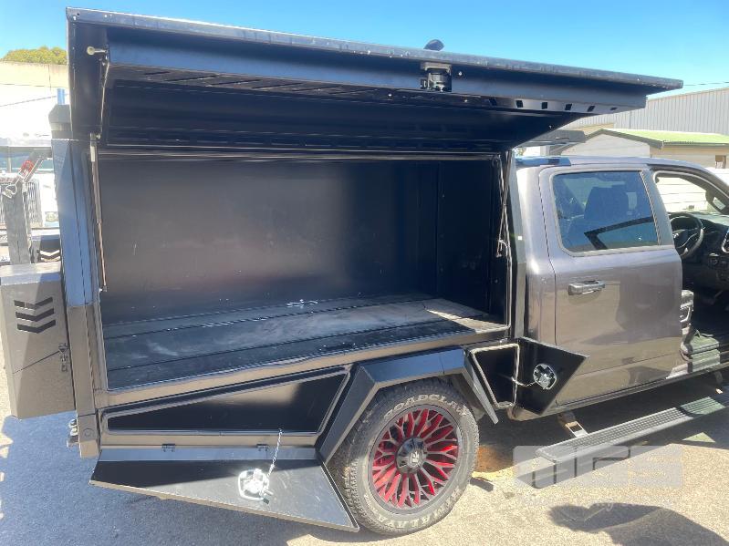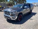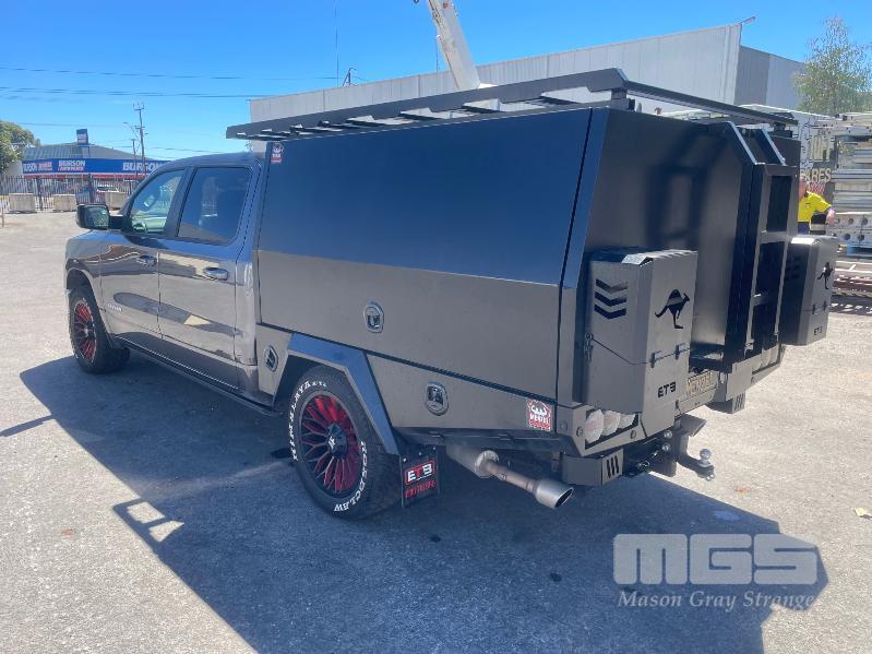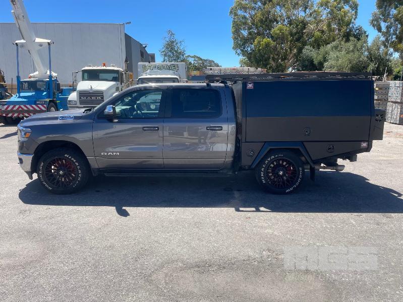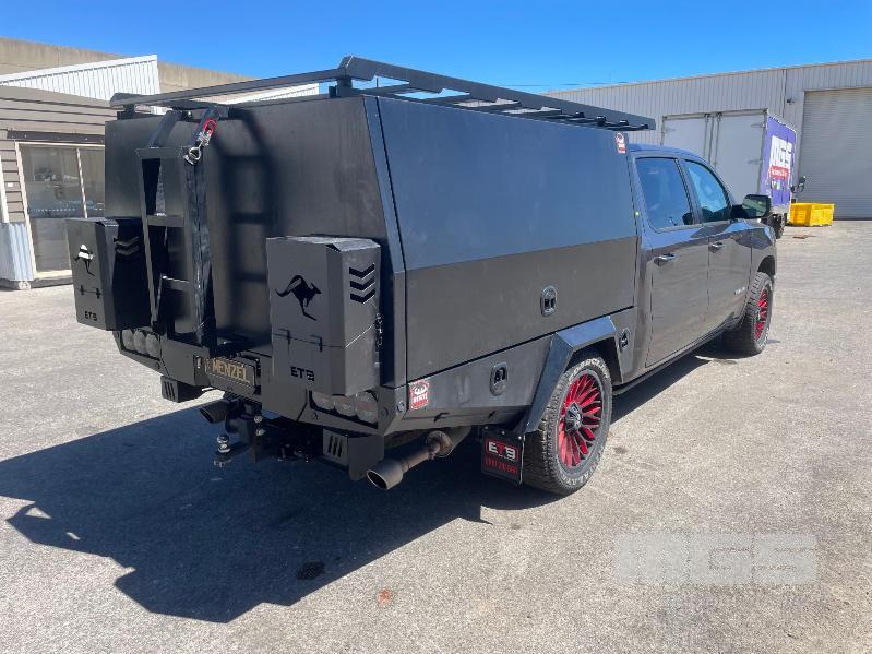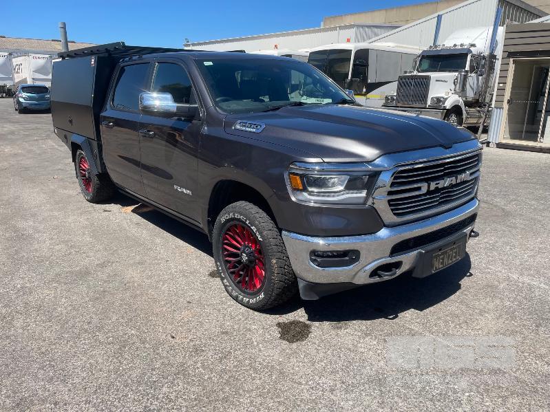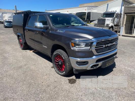 2023 DODGE RAM LARAMIE 1500 DUAL CAB PICKUP 4X4 REG: MENZEL VIN: 1C6SRFJT9RN119053 ODO: 23992km 5.7L PMPFI V8, 8 SPEED AUTO, PETROL/HYBRID, GREY, 4 DOORS, 5 SEAT, 4X4 ABS, AIR BAG, AIR CON, ALLOY WHEELS, BLUETOOTH, CENTRAL LOCKING, CRUISE CONTROL, IMMOBILISER, POWER STEERING, POWER WINDOWS, ROOF RACKS, SIDE STEP, SPARE WHEEL, SUNROOF, TOOL BOX, TOW BAR, TRACTION CONTROL, ETB CANOPY WITH REAR ACCESS LADDER, TOOL DRAWERS, 2 x JERRY CAN MOUNTS & CARRY RACK (NO PAPERS, WITH 2 KEY/S)