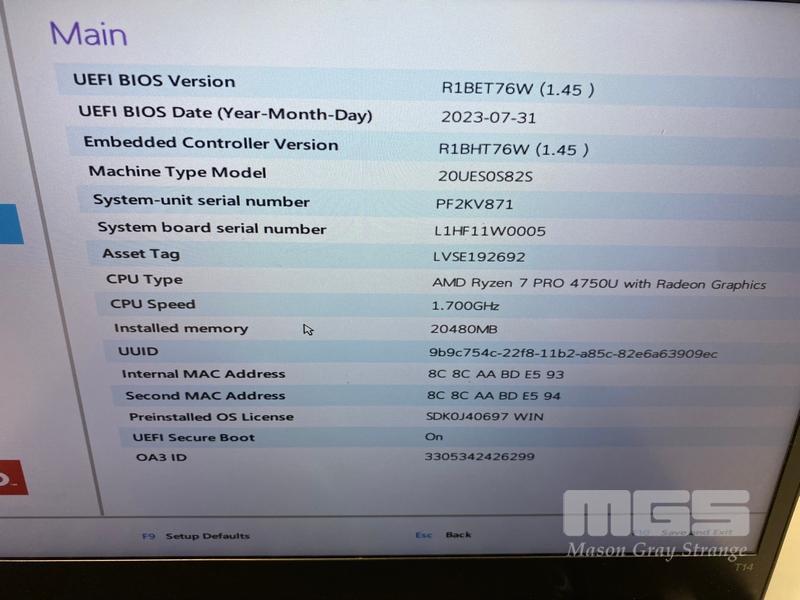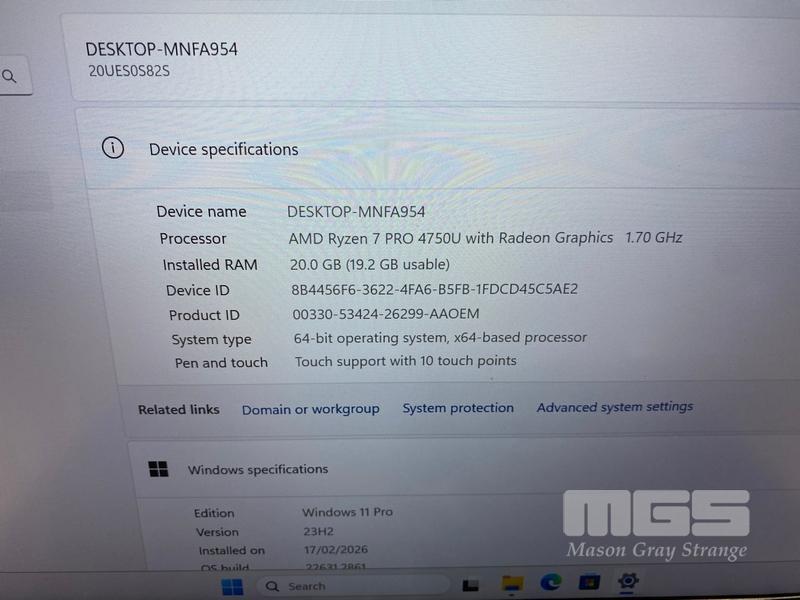 LAPTOP, LENOVO THINKPAD T14 Gen1, TYPE 20UE, AMD RYZEN 7 PRO 4750U @ 1.7GHz, 20GB DDR4 RAM, 512GB NVMe M.2 SSD, 14" TOUCHSCREEN (1920x1080), Wi-Fi, BLUETOOTH, WINDOWS 11 PRO INSTALLED (NO USB-C POWER SUPPLY) (NOTE: MARKS ON SCREEN)