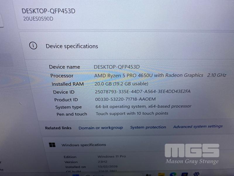 LAPTOP, LENOVO THINKPAD T14 Gen1, TYPE 20UE, AMD RYZEN 5 PRO 4650U @ 2.1GHz, 20GB DDR4 RAM, 512GB NVMe M.2 SSD, 14" TOUCHSCREEN (1920x1080), Wi-Fi, BLUETOOTH, WINDOWS 11 PRO INSTALLED (NO USB-C POWER SUPPLY) (NOTE: SCRATCH & MINOR MARKS ON SCREEN)