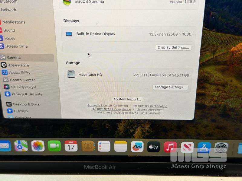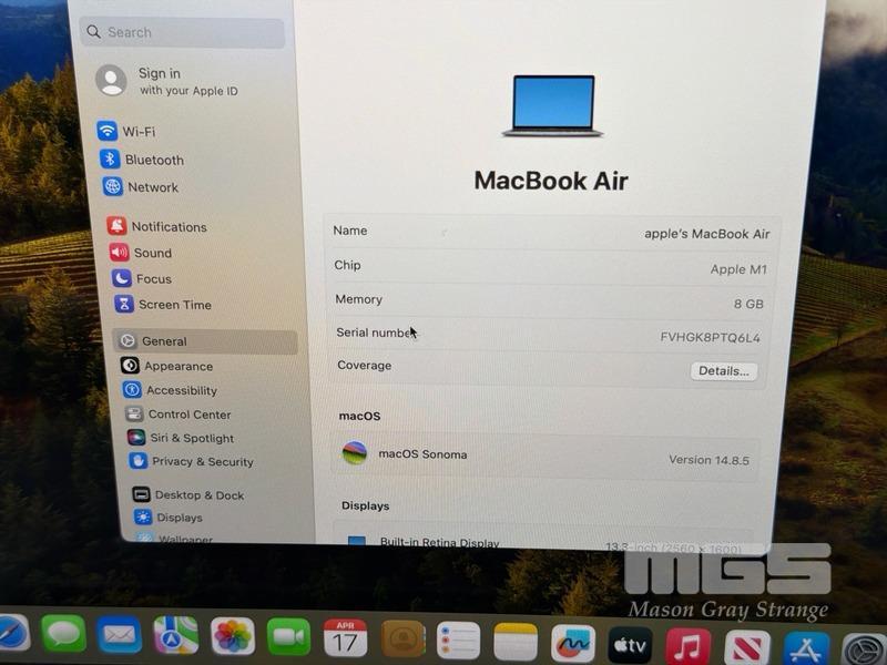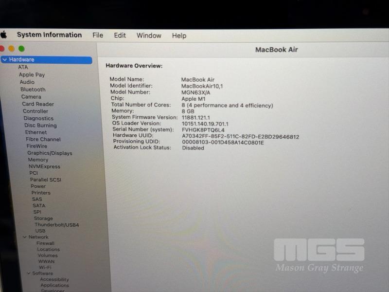 LAPTOP, APPLE MACBOOK AIR (A2337), MGN63X/A, APPLE M1 8 CPU, 7 GPU, 8GB RAM, 256GB SSD, 13.3" RETINA DISPLAY (2560x1600), Wi-Fi, BLUETOOTH, MAC OS 14 INSTALLED & USB-C POWER SUPPLY (30W)