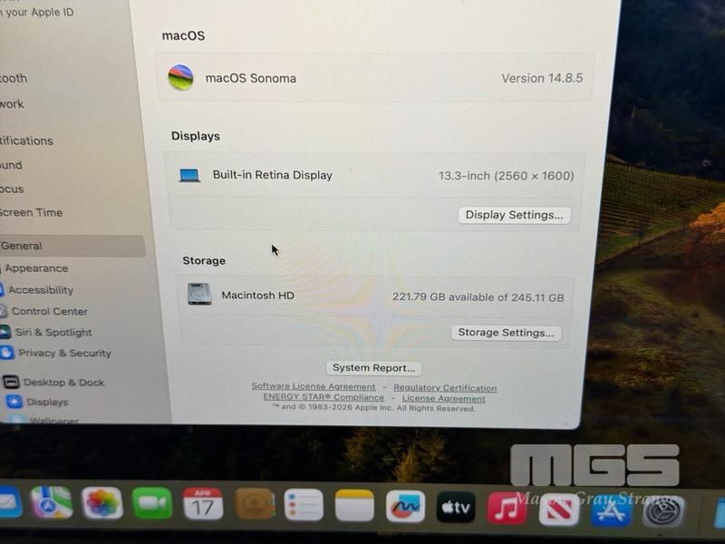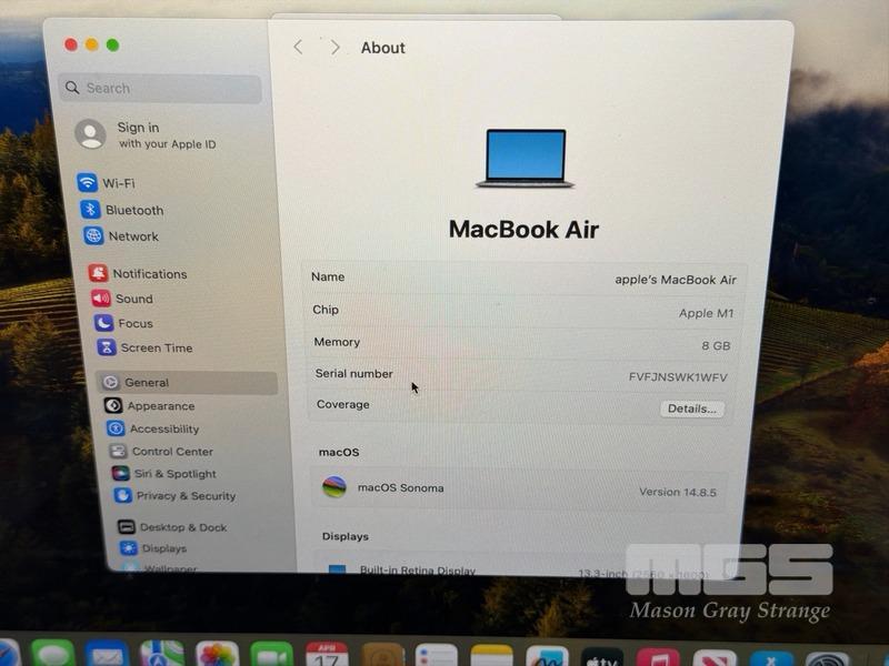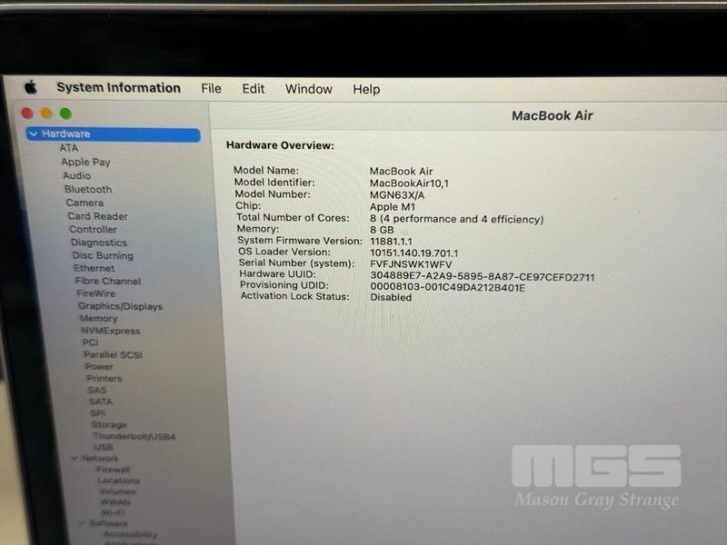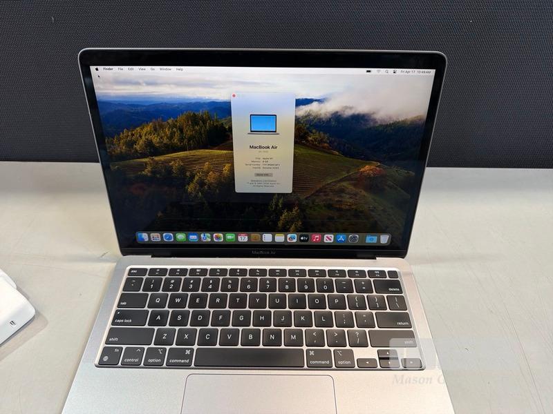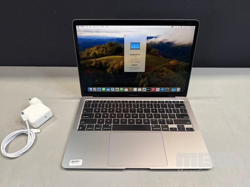 LAPTOP, APPLE MACBOOK AIR (A2337), MGN63X/A, APPLE M1 8 CPU, 7 GPU, 8GB RAM, 256GB SSD, 13.3" RETINA DISPLAY (2560x1600), Wi-Fi, BLUETOOTH, MAC OS 14 INSTALLED & USB-C POWER SUPPLY (30W) (NOTE: MINOR DAMAGE TO CASING, MINOR MARKS ON SCREEN)