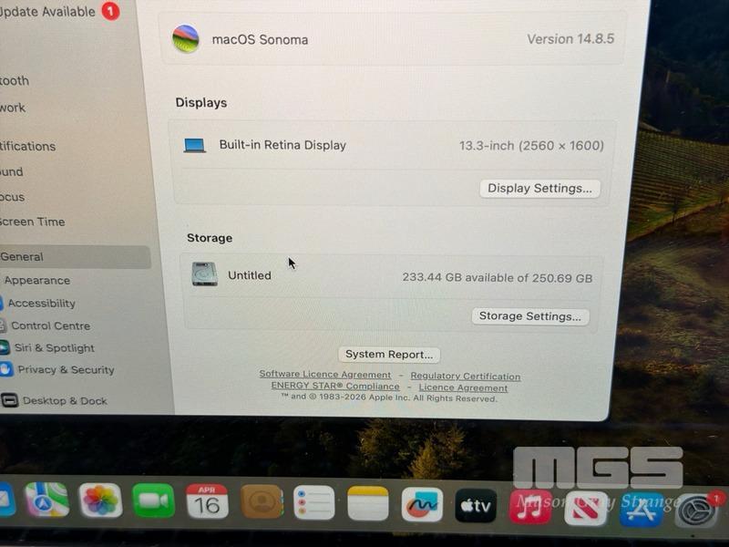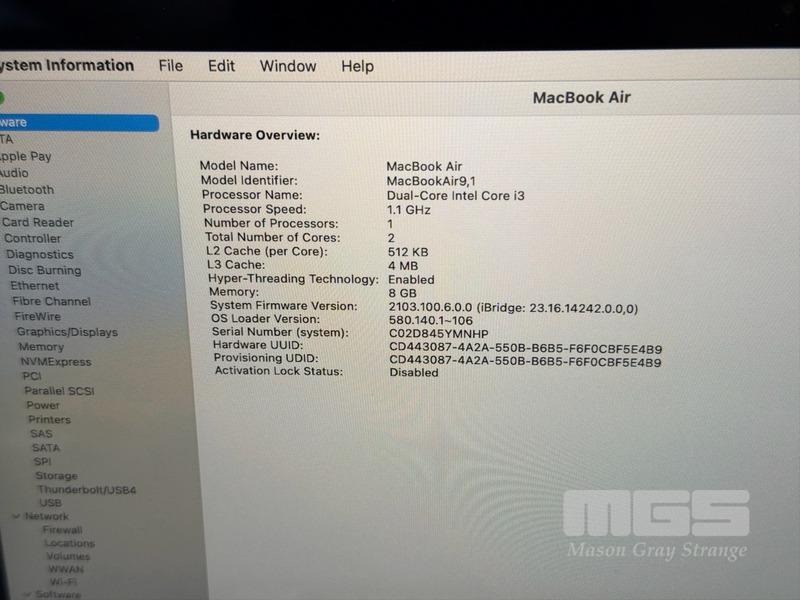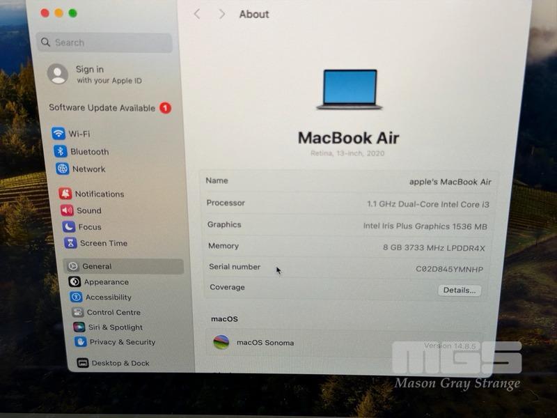 LAPTOP, APPLE MACBOOK AIR (A2179), CORE i3 1000NG4 (10TH GEN) @ 1.1GHz, 8GB RAM, 256GB SSD, 13.3" RETINA DISPLAY (2560x1600), INTEL IRIS PLUS GRAPHICS, Wi-Fi, BLUETOOTH, MAC OS 14 INSTALLED (NO USB-C POWER SUPPLY) (NOTE: MINOR DENT IN CASING, MINOR MARKS ON SCREEN)