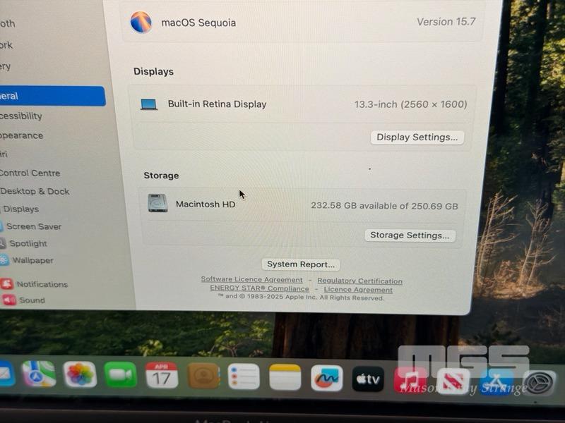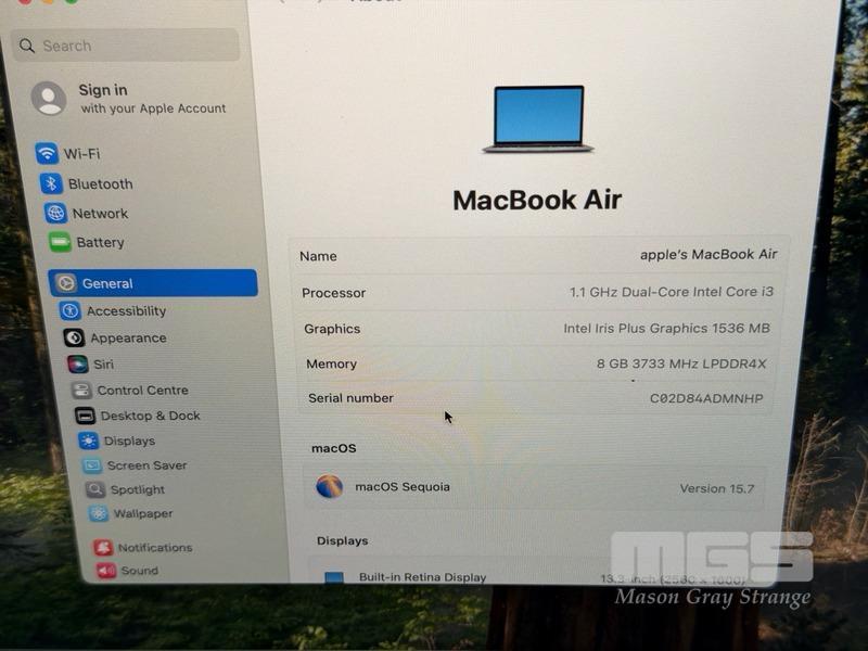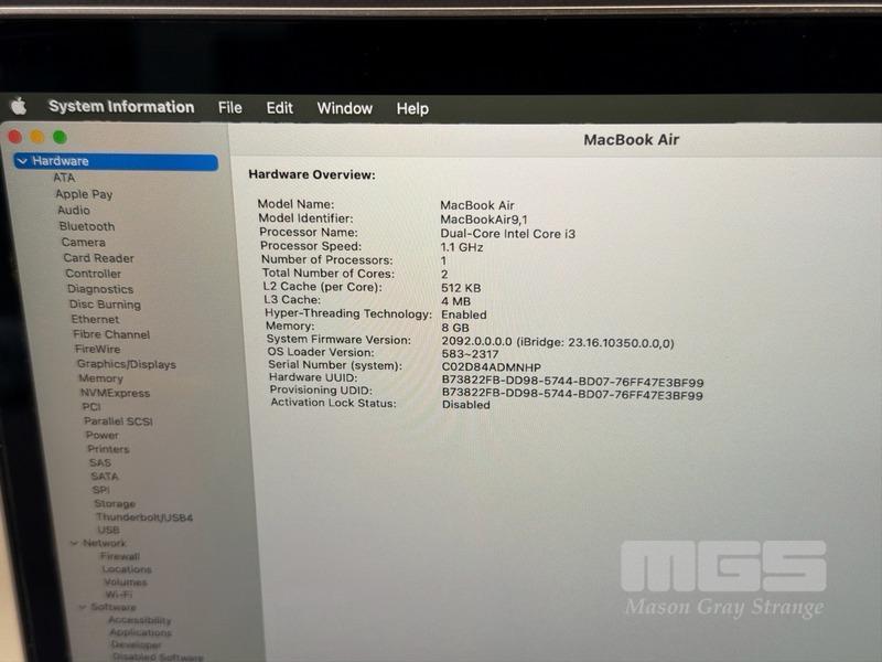 LAPTOP, APPLE MACBOOK AIR (A2179), CORE i3 1000NG4 (10TH GEN) @ 1.1GHz, 8GB RAM, 256GB SSD, 13.3" RETINA DISPLAY (2560x1600), INTEL IRIS PLUS GRAPHICS, Wi-Fi, BLUETOOTH, MAC OS 15 INSTALLED (NO USB-C POWER SUPPLY)