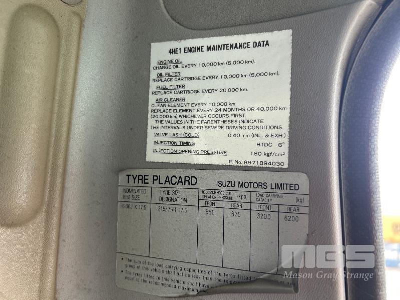 1999 ISUZU NQR W8 4x2 SINGLE CAB PANTEC REG: WKD 827 VIN: JAAN1R70RX7100533 ENG: 686889 ODO: 464,468ksm SHOWING GVM: 8,500kg GCM: 10,500kg 4 CYLINDER TURBO DIESEL, 6 SPEED MANUAL TRANSMISSION, SPRING SUSPENSION, WHITE DUCO, 2 DOORS, 3 SEAT, AIR CON, BULL BAR, DRIVING LIGHTS, STEEL RIMS, PANTEC BODY 5400 (L) x 2500 (W) x 1900mm (H) FITTED WITH REAR HYDRAULIC TAILGATE LOADER & REAR STEP KEY #24 (WITH PAPERS, WITH 1 KEY/S)