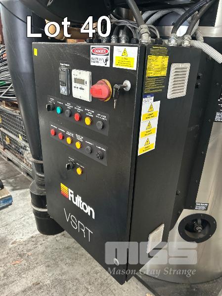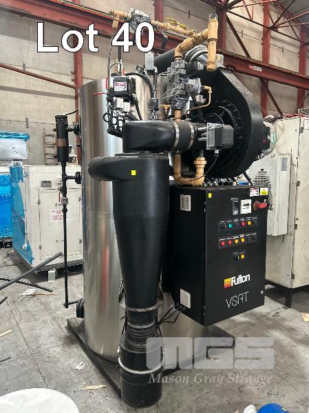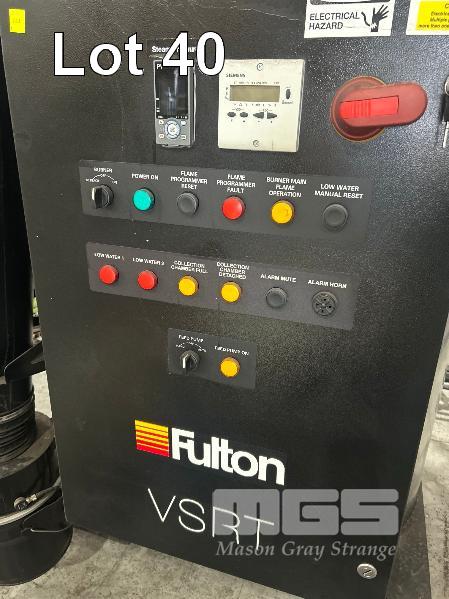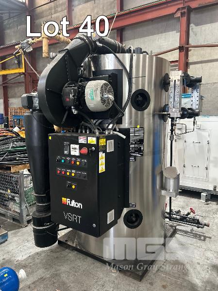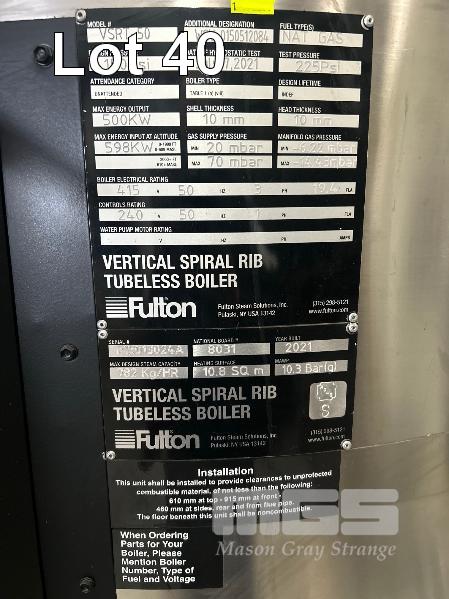 BOILER, FULTON MOD: VSRT-50 VERTICAL SPIRAL RIB TUBELESS BOILER DOM: 2021 ADD DESIGNATION: WSV-0150512084 S/NO: F1S013024A ENERGY OUTPUT 500kw MAX STEAM CAP: 782kg/HOUR MAWP: 10.3 BAR NATURAL GAS & 415V WITH ACCESSORIES INCLUDING: FILTRATION UNIT, GRUNDFOS PUMP, PRESSURE RELIFE VALVE WATER TREARMENT CHEMICALS, ETC (ON PALLET)