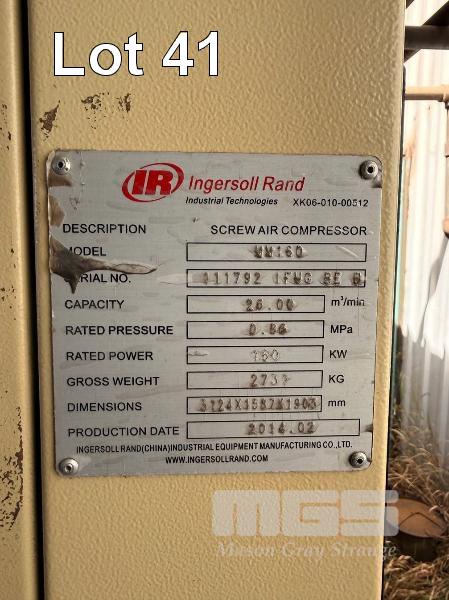 PACKAGED SCREW AIR COMPRESSOR, INGERSOLL RAND MOD: MM160 S/NO: 111792 IFHG BEB DOM: 2014 CAPACITY: 26.00m3/MIN RATED PRESSURE: 0.86 MP RATED POWER: 160kw HOURS: 11,365 SHOWING TOTAL (5320 LODAED) SOLD IN SITU, LOCATED AT 39 COX ST, WINGFIELD PLEASE CONTACT CHRIS SAWYER 0411 619 777 TO ARRANGE INSPECTION THERE WILL BE A FORKLIFT ON SITE FOR LOADING