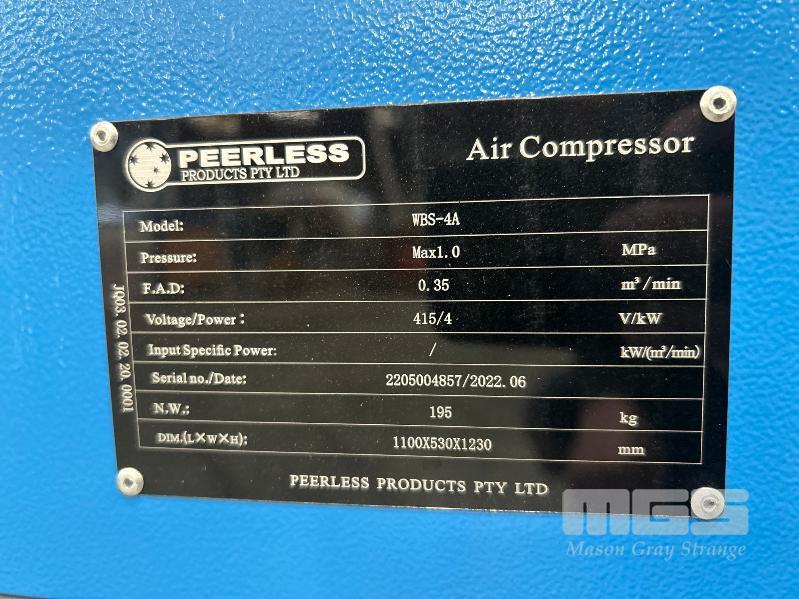 AIR COMPRESSOR, PEERLESS, MODEL:WBS-4A MAX PRESSURE: 1.0 MPa F.A.D. 0.35 m3/MIN 415 V