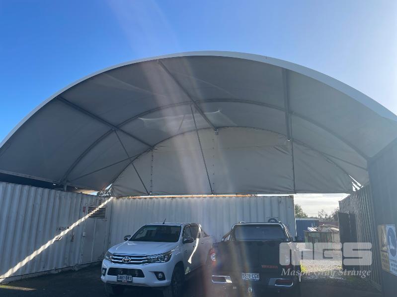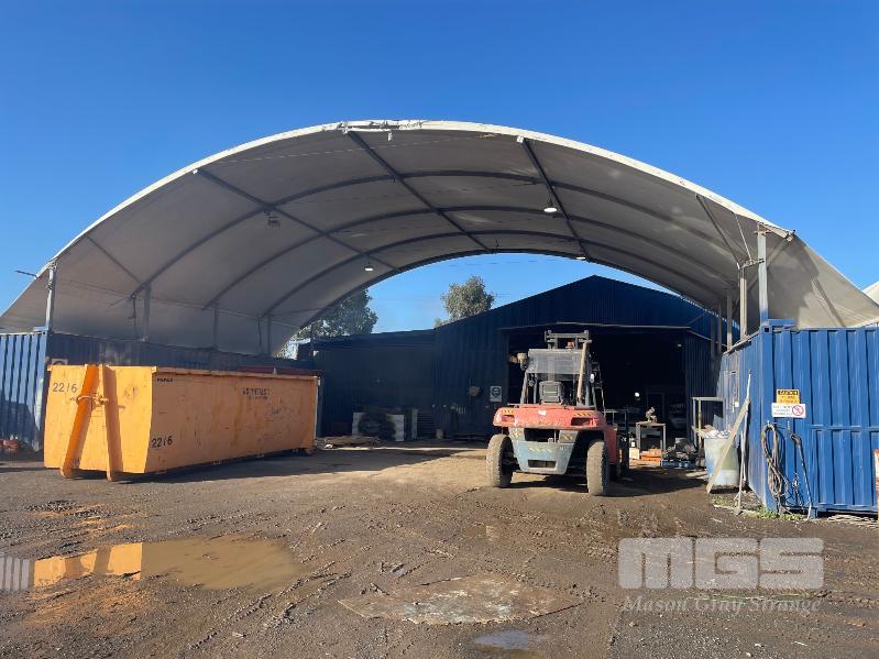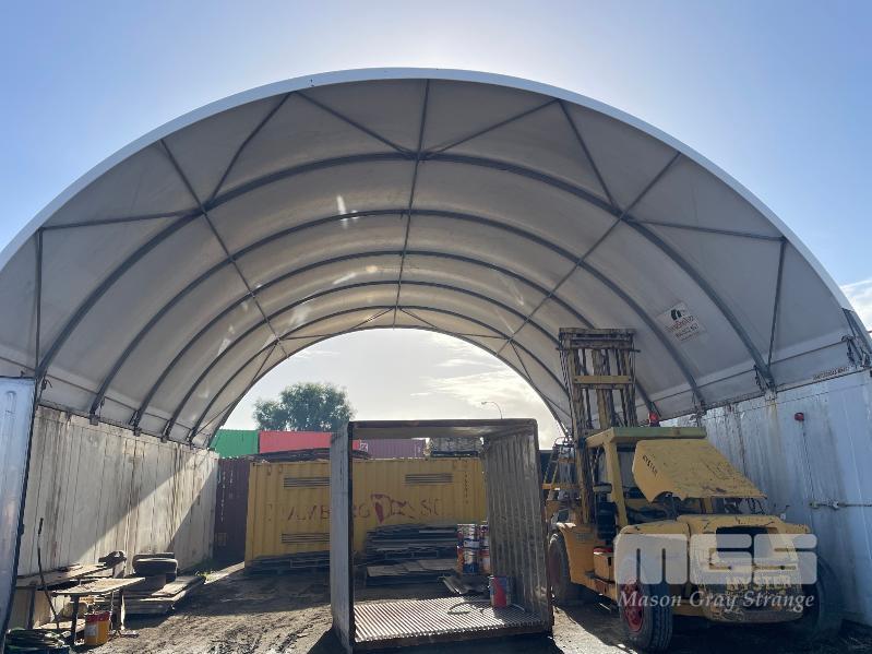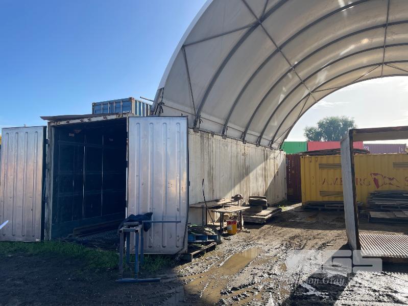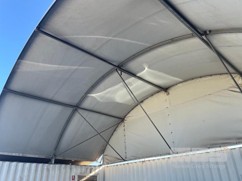 IGLOO 12 X 15 METER APP WITH 2 X 12 METER WORKSHOP CONTAINERS PLUS BENCHES AND SIDE ACCESS.