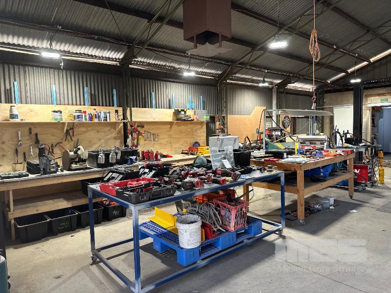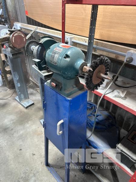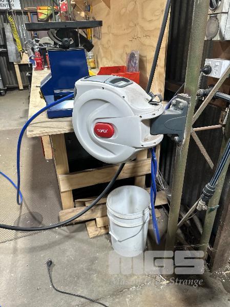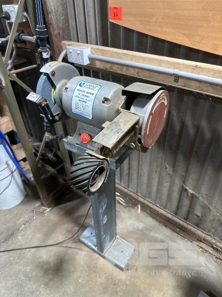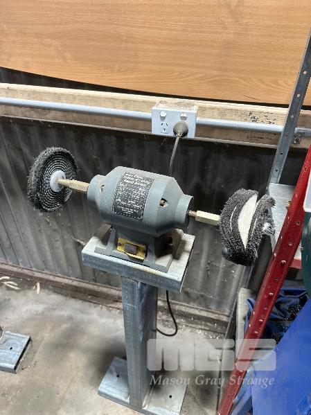 BOBBIN SANDER, LINISHER, GRINDERS, DRILL PRESS & AIR REEL.