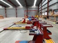 Pryda & Mitek Timber Truss Jig Assembly lines With Travelling Gantry's, Kwik Press Bottom Cord Press, Radial Arm Saw & Radial Trenching Saw Table.